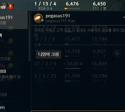 미드 야스오는 왜 사는 걸까? 잘하면 모르겠다만 음... 라인전 다 져놓고 정글차이 바텀차이 외치는 건 인간이 아니란 거겠지??? 리폿했으니까 댓다 히히