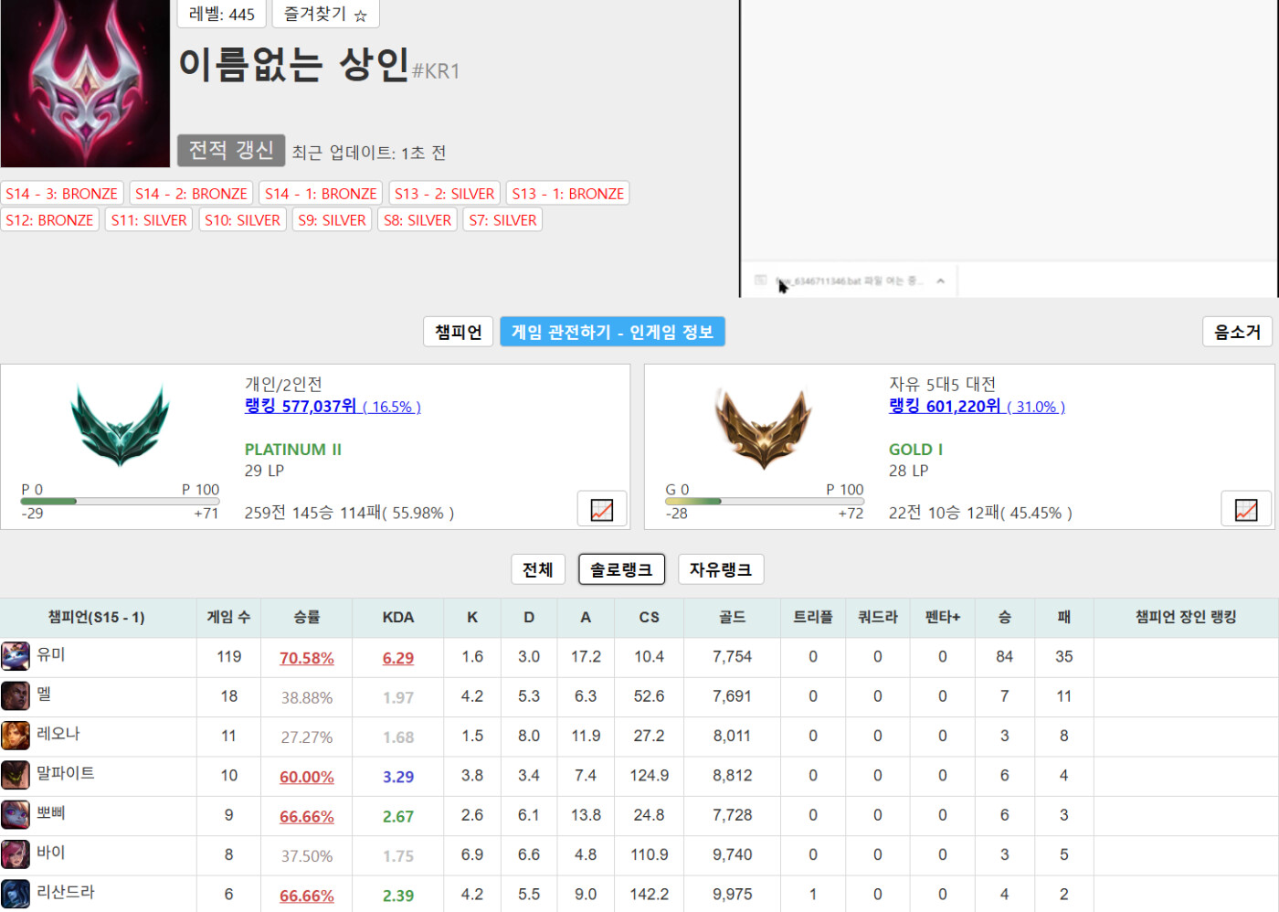전적 검색 후 솔로랭크 전적 보면 아군 원딜이 다 같은 신기한 현상을 볼 수 있음. 인성도 개 더러움 ^^ 게임 캐리는 못하면서 아군은 티어로 깍아내리는 모습 보기 역했지만 딱 본인 수준의 행동 이였어요. ^^