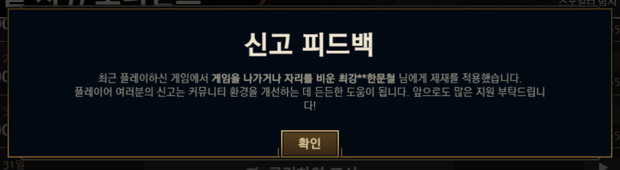 요네 상대로 겁나 허벌라이프 하고 서렌ㄱㄱ 이러길래 던져놓고 서렌하는거 역겹다고하니까(절대로 욕은 안함) 쌍욕 존시나게하면서 히키같은놈 관심주면 안된다 등등 멸시하는투로 게거품처물길래 욕설,부정적태도로 신고넣으니까 오늘 처리됐다 꺼어어어억~~~~~ 욕설신고인데 왜 자리비움인진 모르겠다 암튼 다음겜에서는 게거품물지말자 친구야~