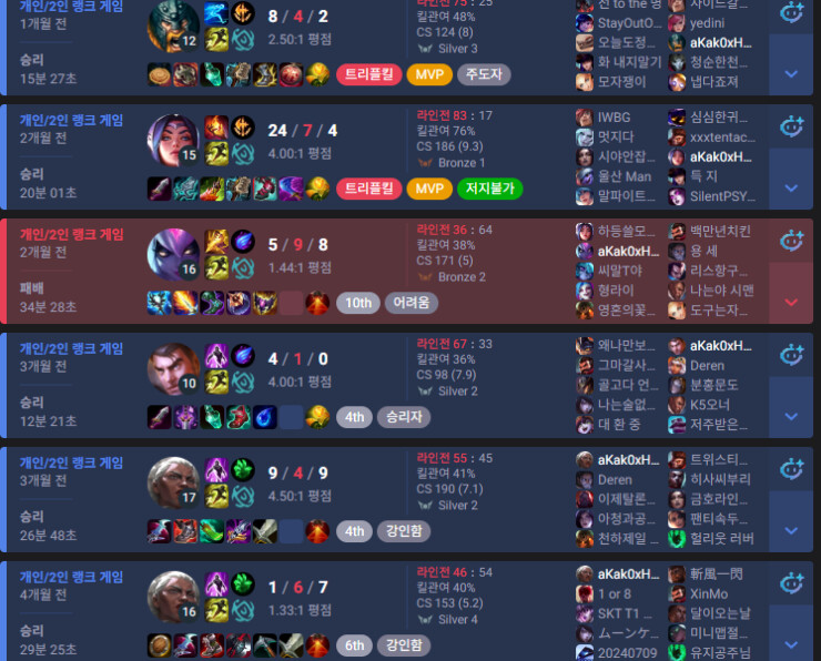 이사람 원래 브론즈 4였는데 갑자기 플레 1 이됨 그리고 수상한점은 올라프 챔프라는것을 아예 하지도않았놓고선 갑자기 올라프로 80퍼 이상 승률을 가지고있는게 말이안됨 어떻게 3개월이 지났는데 어떻게 올라프로 브론즈에서 플레까지 다이렉트로 가는게 이해가 안되고 이사람 본주는 지금 캐나다 토론토에 있으면서 대리인은 한국에있음 말이안되고 진짜 대리 유저는 꼭 잡았으면 좋겠음 이사람 보면 신고 한번씩 해주세요 원래 브론즈 였던사람입니다 밑에 암베사 이게 본인꺼에요