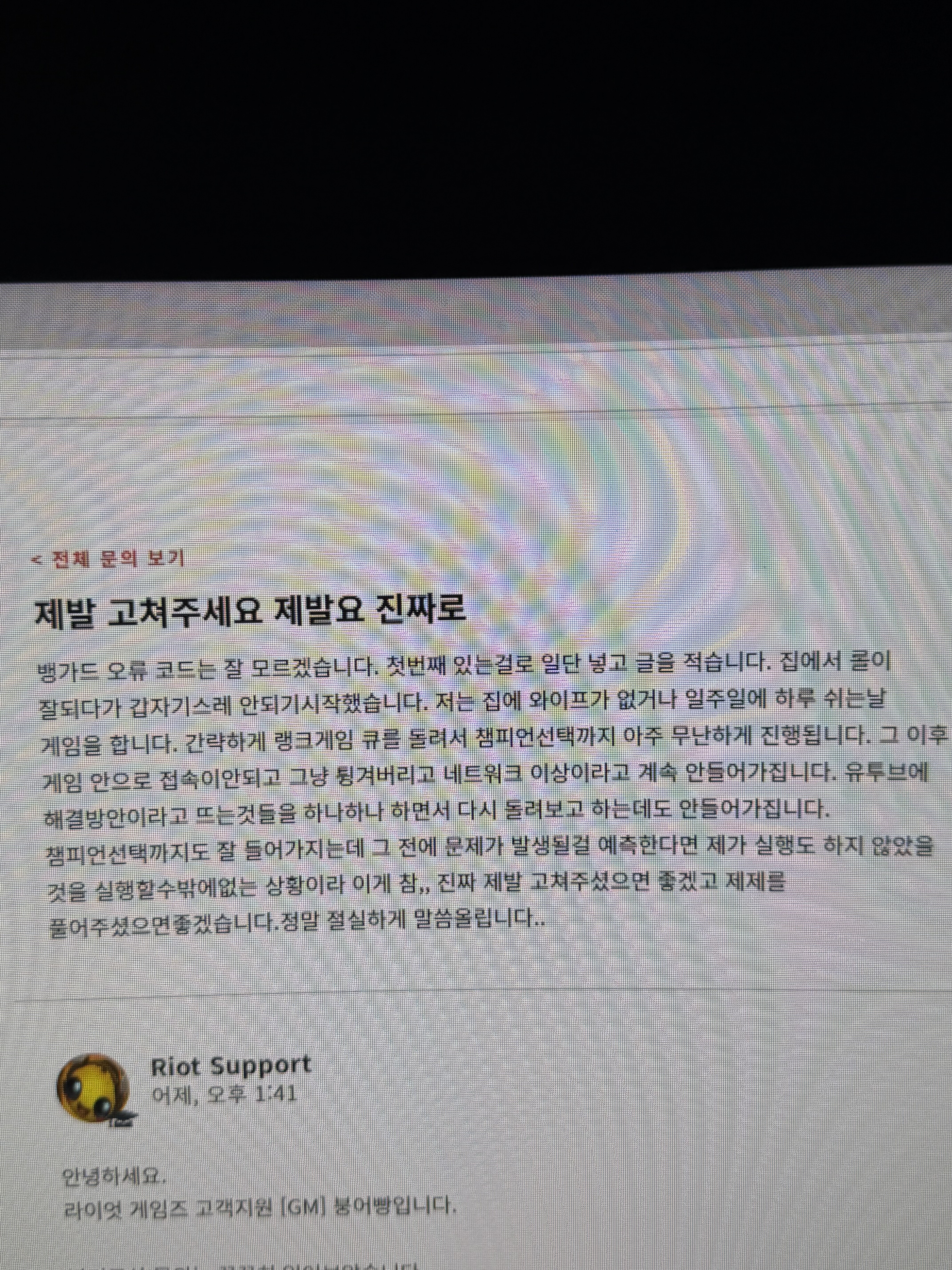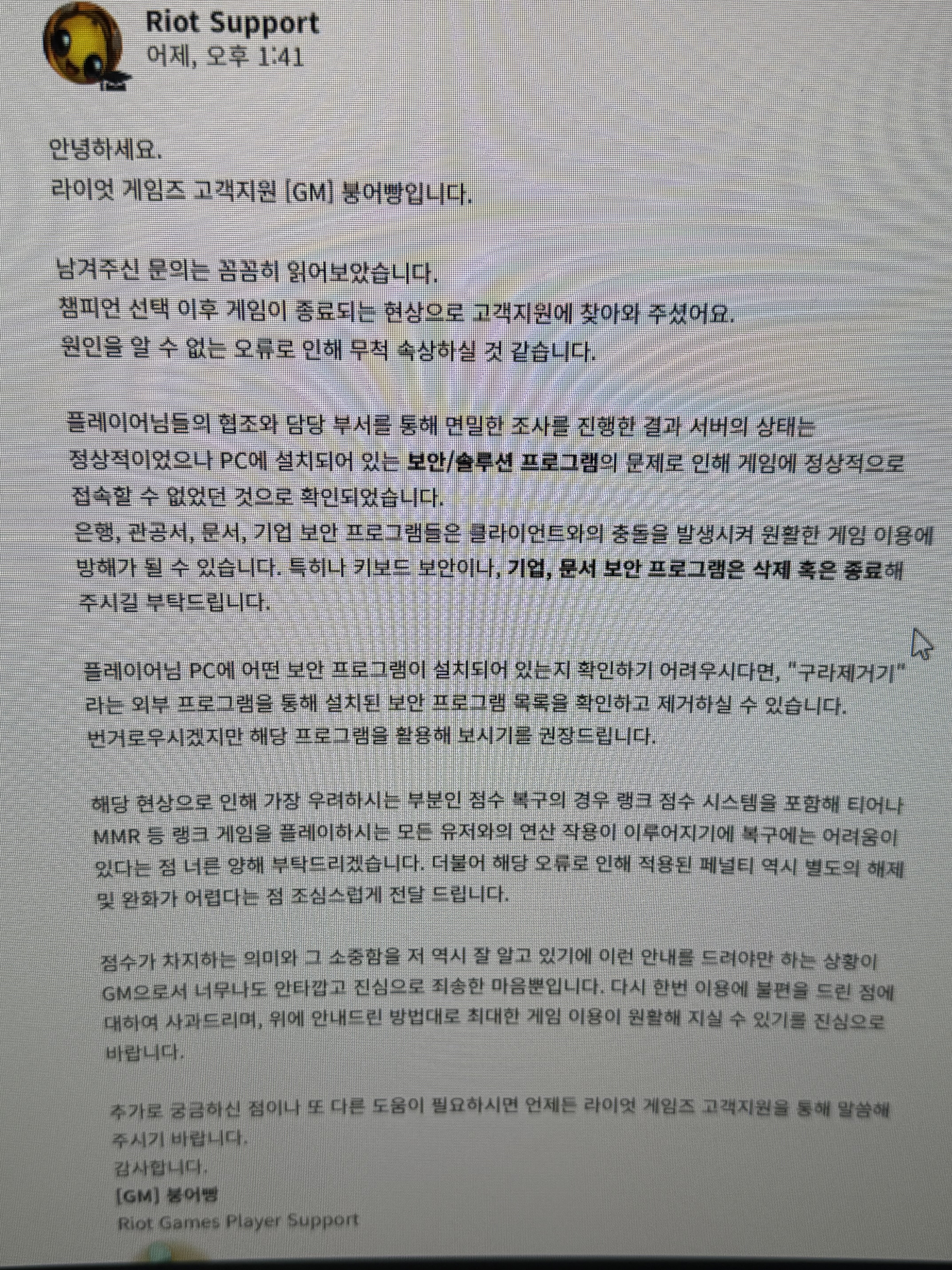 정상적으로 접속 할 수 없었던 상황인걸 인지했는데도 점수가 아닌 패널티만이라도 해지해줬음 좋겠던걸 일주일에 하루 이틀 게임 하는 사람한테 너무 가혹하다 구라제거기라는 외부 프로그램이 어떤 프로그램일줄 알고 추천하고 사용하라는건지 그런 프로그램이있으면 비슷하게 만들어서 다운로드 받을 수 있도록 만들어놓던지 하,, 진짜 운영을 어떻게하는건지 요즘 롤 유저들 왜 떠나가는지 알거 같네요;