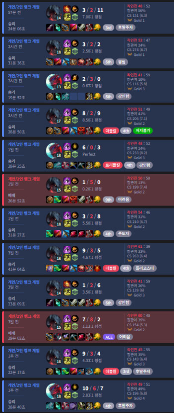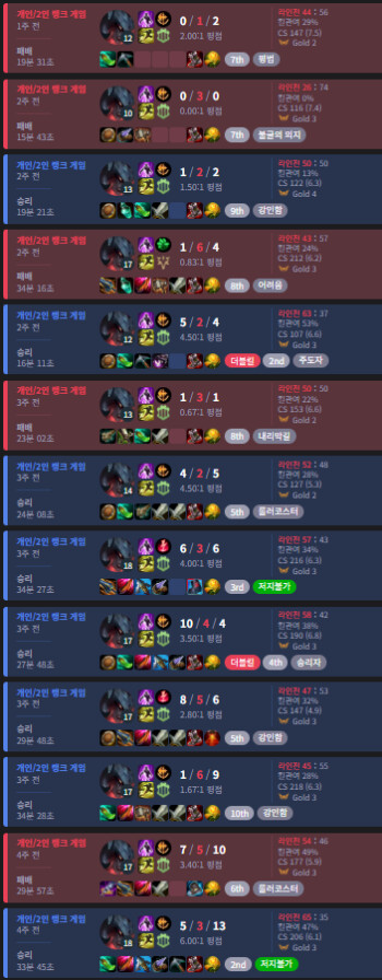 최근 20게임 보면 그닥 캐리한 판이 없음 그냥 앞에서 다맞고 어그로 끄는 플레이가 대부분임(=팀운 원툴 탑) 이게 실버~골드 초반까지는 어떤 상대가 와도 찢는 판이 대부분이었어서 더 체감이 되더라고