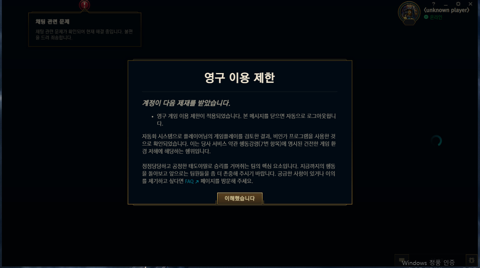 내가 비인가 프로그램 (핵)을 썻다는거야? 이해를 못 했는데 이해했습니다만 누를 수 있네 이의를 제기하려고 FAQ눌렀는데 어디다 숨겨둔건지 찾을 수가 없네