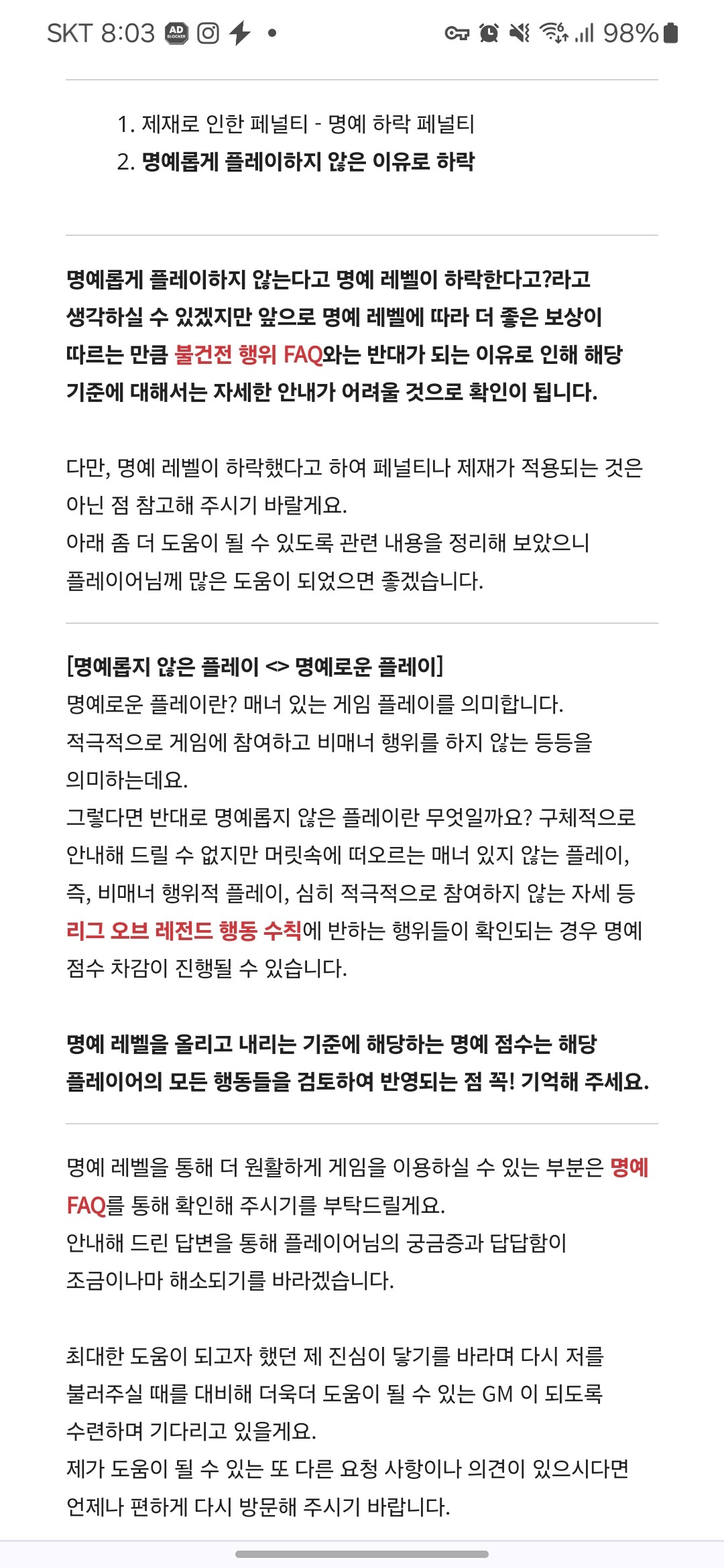 정지 안당했는데 명예 강등됐는데 이유 좀;