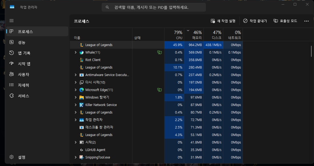 픽창 끝나고 로딩중떄 튕기고 설치에 오류가 감지되었습니다 손상된 파일을 복구합니다 가 계속 떠서 랭크 페널티 많이 먹게되었고 작업관리자에 가보니깐 롤이 cpu 와 메모리 다 먹고 원래 이런가요? 2주전부터 계속 지속되고 이번주부터 너무 심해서 해결방법 아시는분이 있을까봐 글을 올려봅니다 랭크 하고싶습니다 해결방법 알려주세요 형님들