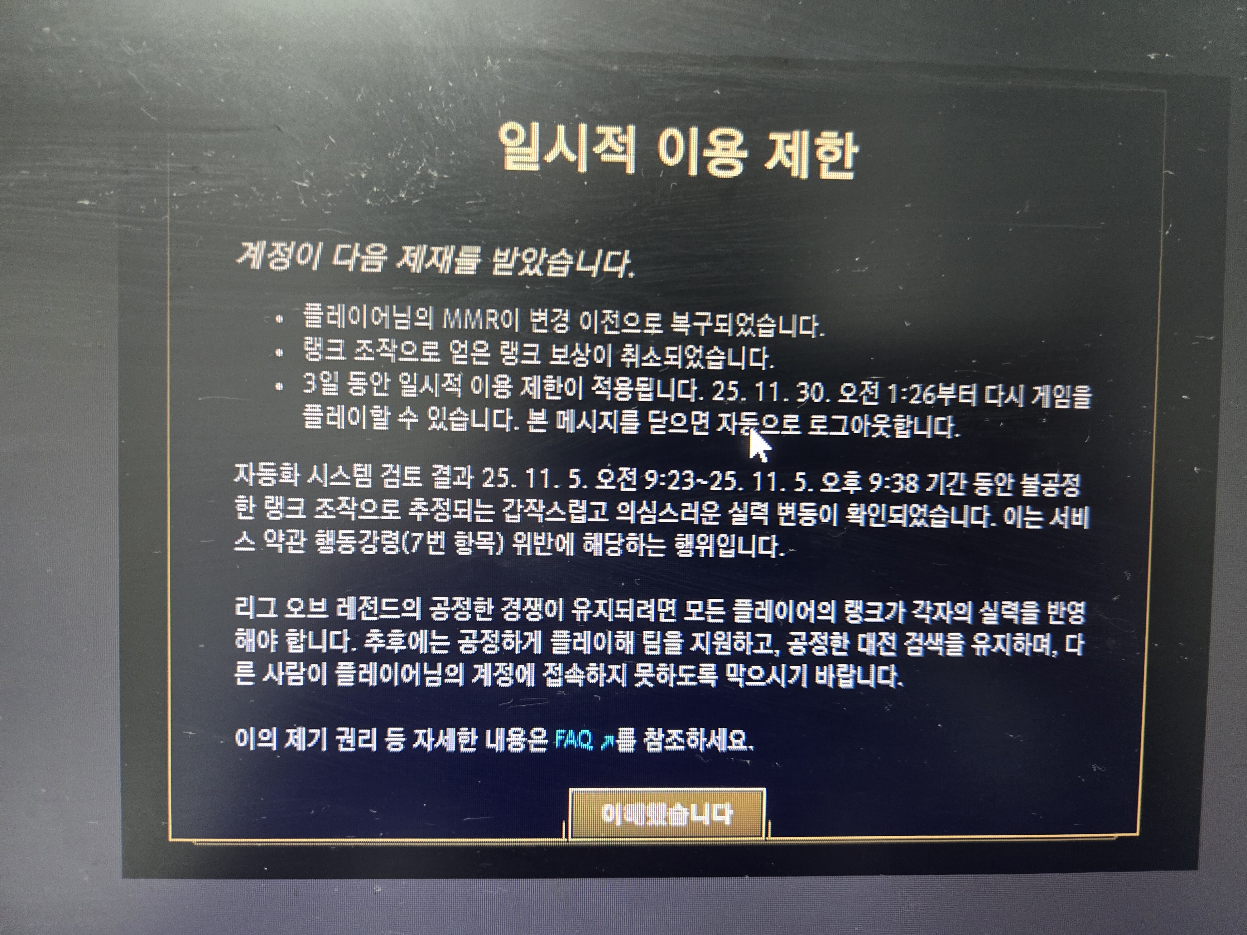 저는 제가 대리를 한적도 대리를 받은적도 없는 사람입니다 친구한테 계정을 빌려준적도 없고 집 pc방 두곳에서만 게임을 했습니다 문의를 넣어봐도 "반복적 패턴" 이 보인다고 안풀어준다고 하네요 점수 도 한300점 떨궈 놨던데 아래 기간을 보면 13분동안 의심이 든다고 하는데 300점 떨군것도 짜증나도 명예 5랩인데 떨어진것도 짜증나네요 이거 방법 없나요? 저는 결백합니다.