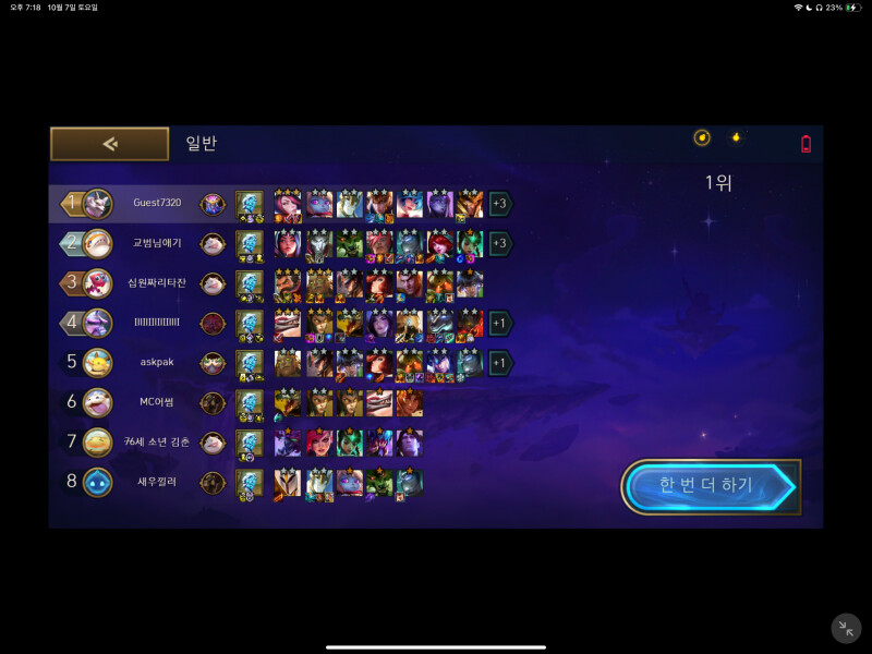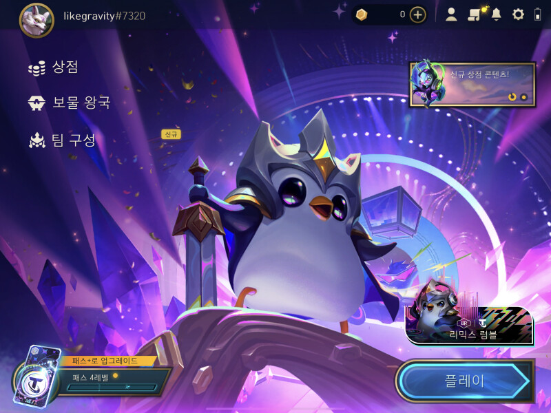 원래 아이패드에서 TFT를 하려면 사진과같이 어딘가 많이 모자란 해상도로 플레이해야만했다. 특히, 12.9인치 아이패드면 더더욱이. 그런데 10시즌 패치 후, 로딩창 어라, 내가 알던 로딩창이 아니다 분명 16:9비율을 어거지로 끼워맟춘 해상도였을텐데. 로딩화면만이 아니다. 메인화면도, 심지어 인게임화면마저도 완벽하게 지원한다 아이 행복해라. 아이패드 유저들도 이제 즐겁게 게임하자