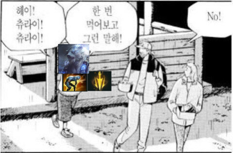 아무튼 이 챔피언은 전사지만 "쿨타임 감소" 와 "내구력" 그리고 "추격력" 이 가장 중요시 됩니다. 핵심 스킬인 W는 공격력 계수가 존재는 하나 w는 딜 보다도 회복으로 버티는 것에 중점을 둔 스킬이기 때문에 높은 가속과 버틸 수 있는 체력이 필요하죠. 이것에 딱 맞는게 바로 정령의 형상입니다. 체력, 스킬가속, 마저, 체젠을 주고 부가효과로 받는 회복량 증가까지. 그리고 w를 돌리기 위해선 반드시 적에게 따라붙어야 되기 때문에 추격을 보조할 수단으로 우주의 추진력, 얼어붙은 건틀릿이 있습니다만.. 우추는 내구력에서 떨어지는 면이 존재하기 때문에 괴물같은 성장을 한게 아니라면 추천은 못됩니다.