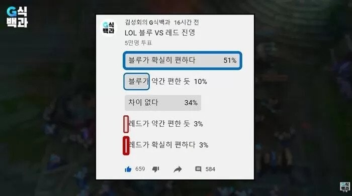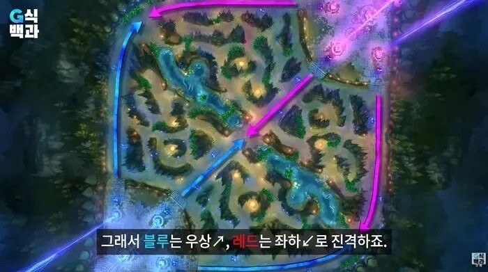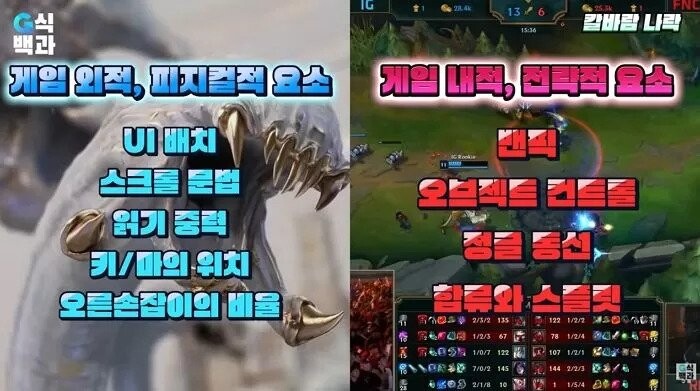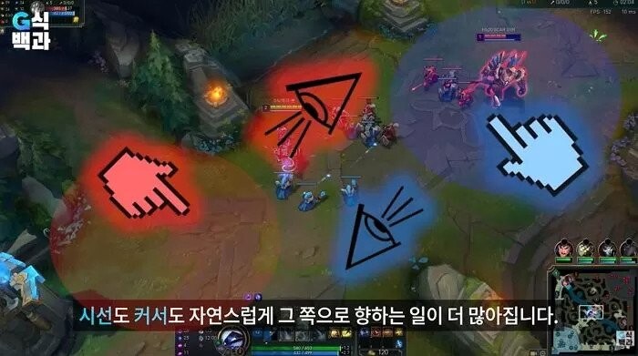 디자인 방법론에 나오는 '구텐베르크 다이어그램' 개념을 예로 들었다. 이는 인간의 시선 집중도는 한 틀 안에서 좌하단이 가장 취약하다는 개념으로, 이론상 시선을 좌하단으로 계속 보내야 하는 레드 진영 유저는 정보 습득이 어려울 수밖에 없다.