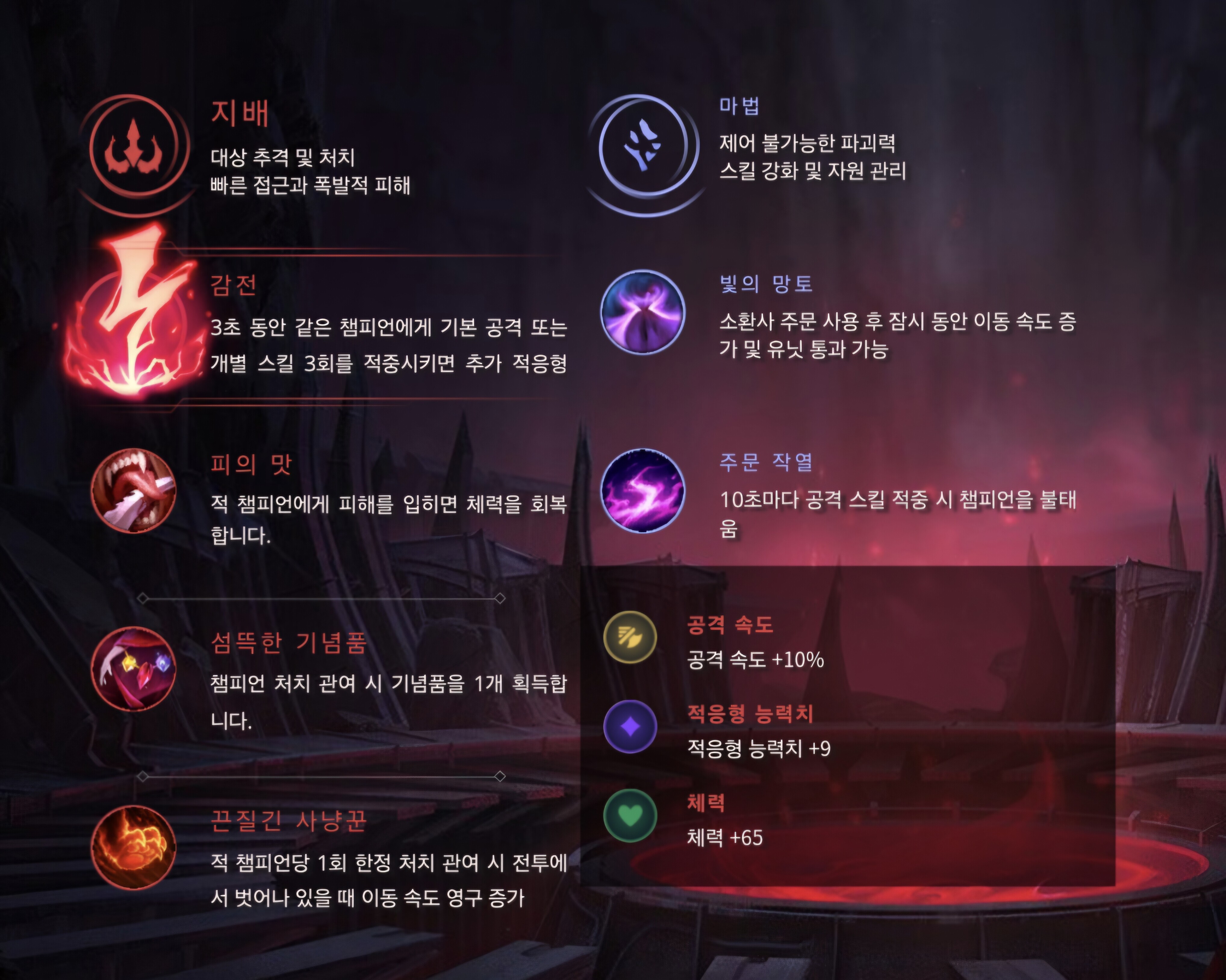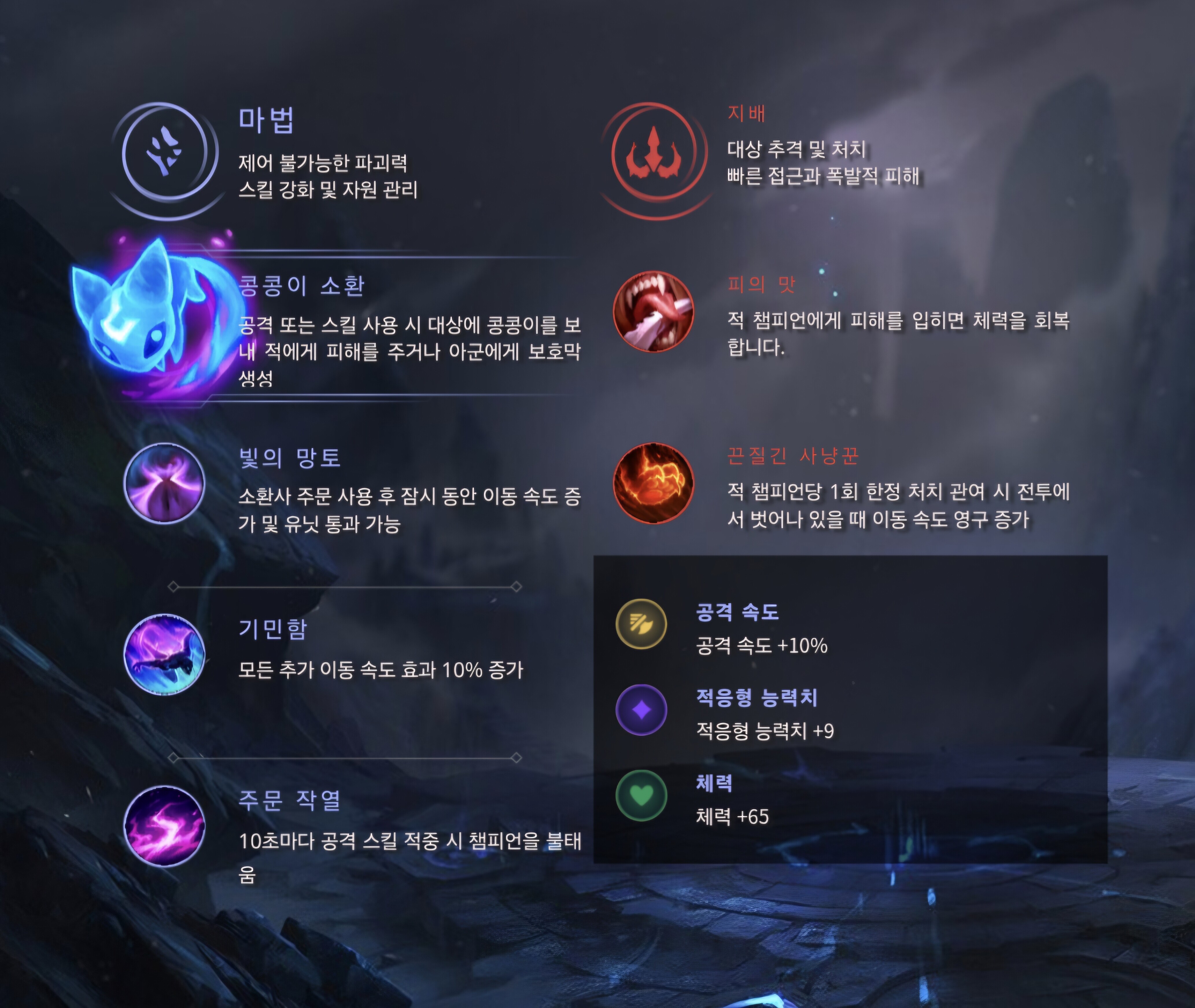 이 룬은 평타로 킬을 내는 룬입니다 짤짤딜이라서 W미사일도 해당입니다 조이는 이속과 공속이 중요하기에 빛망, 기민함, 끈사, 공속 룬을 들어줍니다.