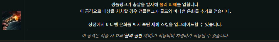 Q스킬로 막타를 칠 시 추가 골드가 들어오는데 다들 망한 갱플이 후반에 왜 나랑 코어가 비슷한지 궁금했을 거임 그건 바로 이놈때문이다