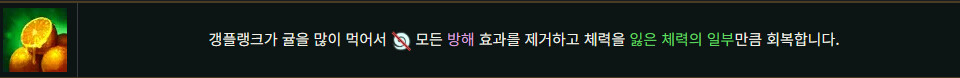 일명 귤, 갱플랭크의 마스코트이자 갱플을 좀 더 띠껍게 만들어주는 핵심 스킬 역시나 옛날 챔프답게 스킬 설명도 간단하다 그냥 간단하게 설명하자면 마나 소모해서 체력 회복하고 모든 CC(에어본 제외)를 W딸깍 하나로 풀 수 있다.