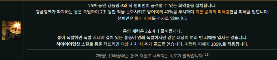 자 2번째줄에 핵심 요소가 있음. **화약통**을 파괴하면 이 스킬의 재사용 대기시간이 초기화