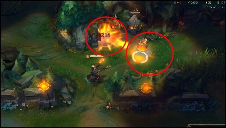 이건 약간의 팁인데 1분 30초쯤에 우리팀 근거리 미니언 살짝 안쪽 위치에 통을 깔고(위치는 하면서 익혀라) 화약통 쿨을 돌리면서 근거리 미니언 피가 거의 줄어들때까지 기다려라. 이때 상대방이 미니언을 먹을려고 할텐데 그때 E-평타로 상대방한테 대미지를 주면서 우위를 가지고 시작할 수 있음