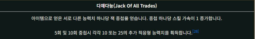 다음은 다재다능임 다재다능은 아이템으로 얻은 서로 다른 능력치 하나당 중첩을 얻고 중첩 하나당 스킬가속이 1씩 올라감 또한 중첩 5회에는 적응형 능력치 10이 올라가고 중첩 10에는 적응형 능력치 25 올라감 공격력은 0.6을 곱해서 적용되니 각각 6, 15 올라감
