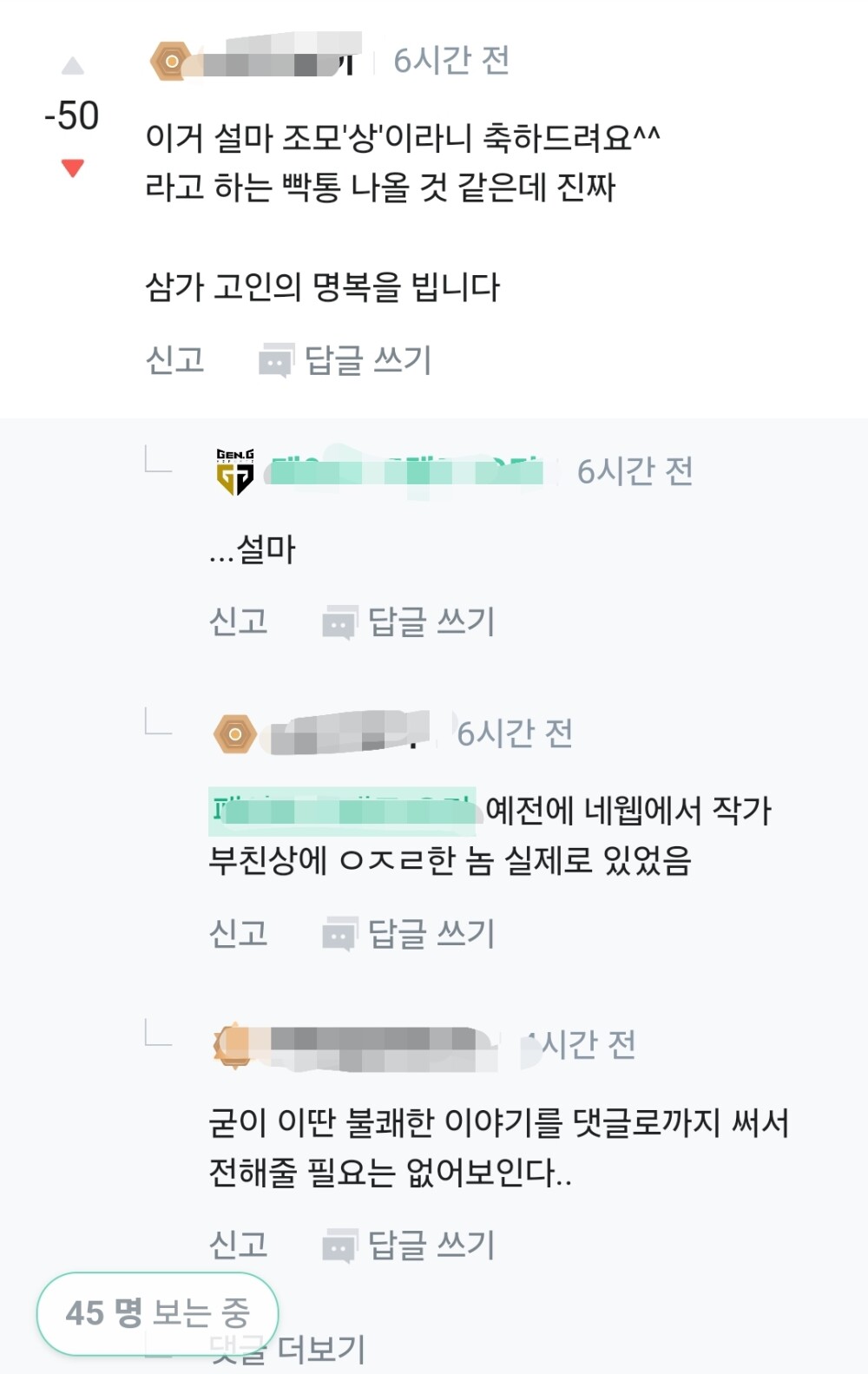아까 111렙인거 확인하고 옵지를 껏었음 그리고 지금보니 109렙 왜 레벨이 떨어진거지 생각하다가 이게 생각남 여기에 댓글을 썻었음 비추댓글에 대댓쓰면 그 비추가 나한테도 박힘 이거 많이 몰랐을듯 걍 댓글에 이상한애 있으면 다같이 비추 누르고 병먹금 하자