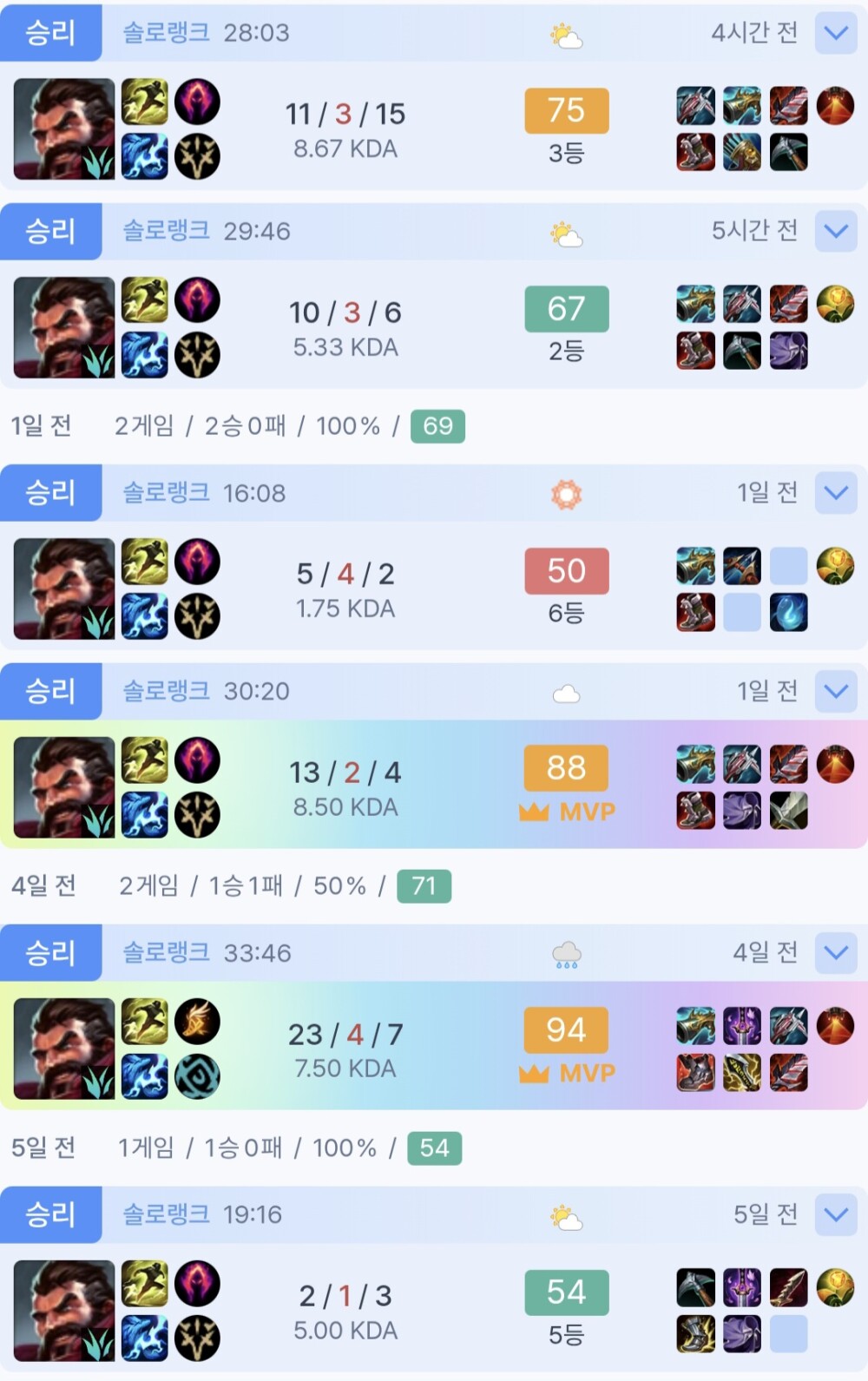 절대로 탱챔이나 후반에 힘빠지는 챔프를 해선 안됩니다 탱챔을 할경우 정글1대1이 약하기에 팀라이너의 라인전이 밀린다면 할수있는것이 없게되고 워윅 짜오같은 후반벨류가 떨어지는 챔프를 한다면 초반에는 잘굴리다가도 라이너똥에 한번 미끌어지면 겜못이깁니다. 저는 그웬 그브 2챔을 기용했습니다 캠핑이빠르고 교전이 강력하며 후반벨류도 좋은 챔프들이라 생각합니다.