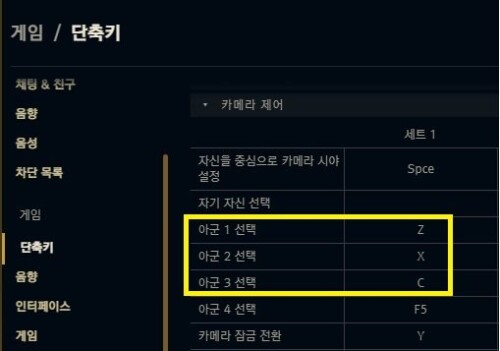 단축키 탭 -> 추가 단축키 탭 -> 카메라 제어에서 아군 1,2,3 선택을 ZXC로 바꾸기