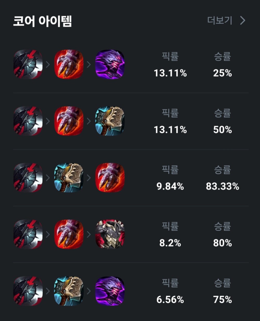 위에 사진은 우르곳 템트리인데, 어떻게 3코어까지 픽률 1위 템트리조차 13.11%가 나와
