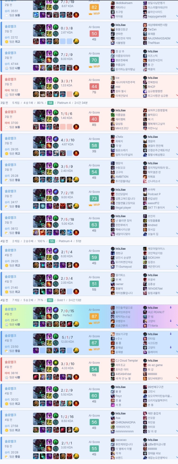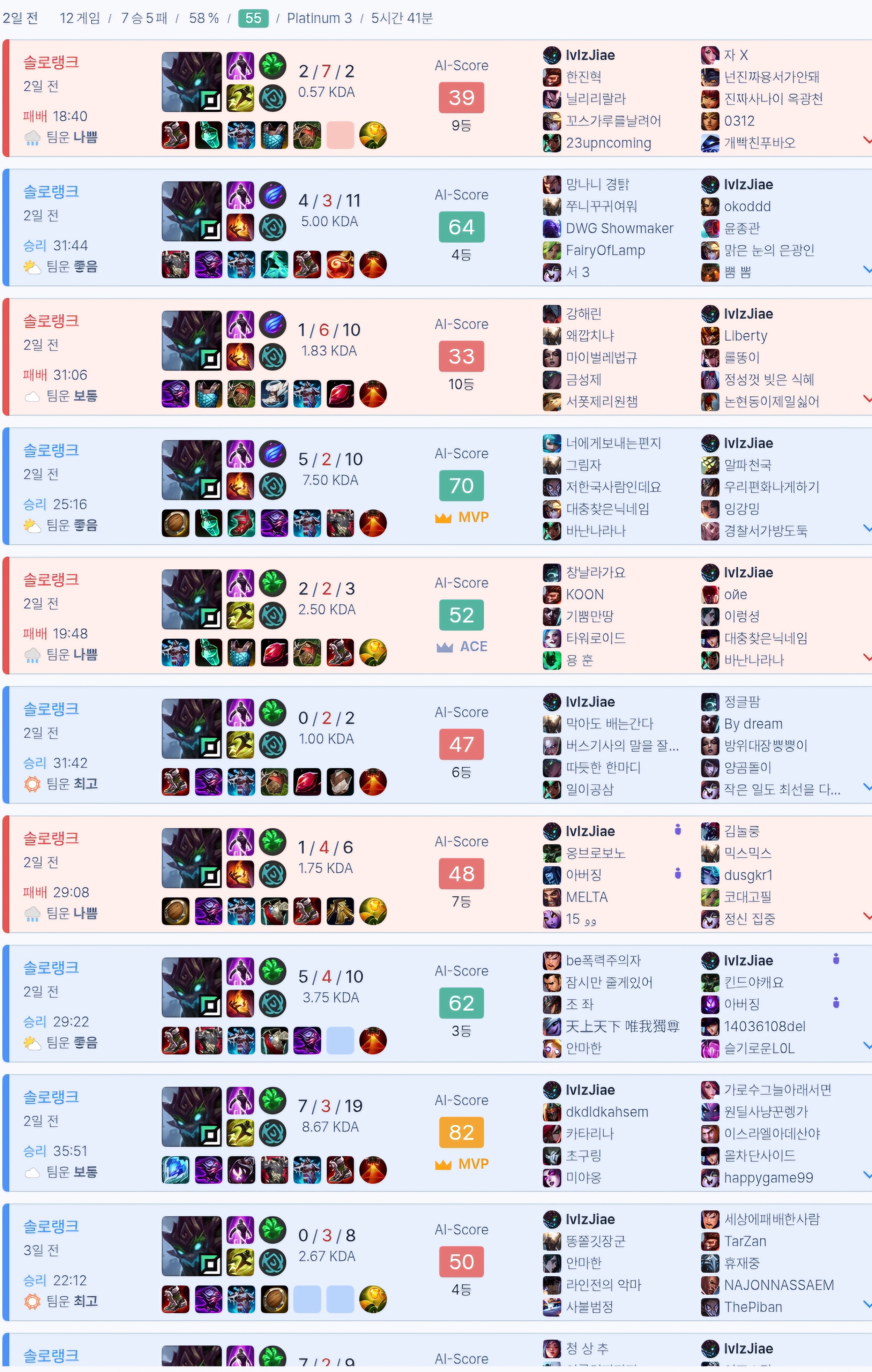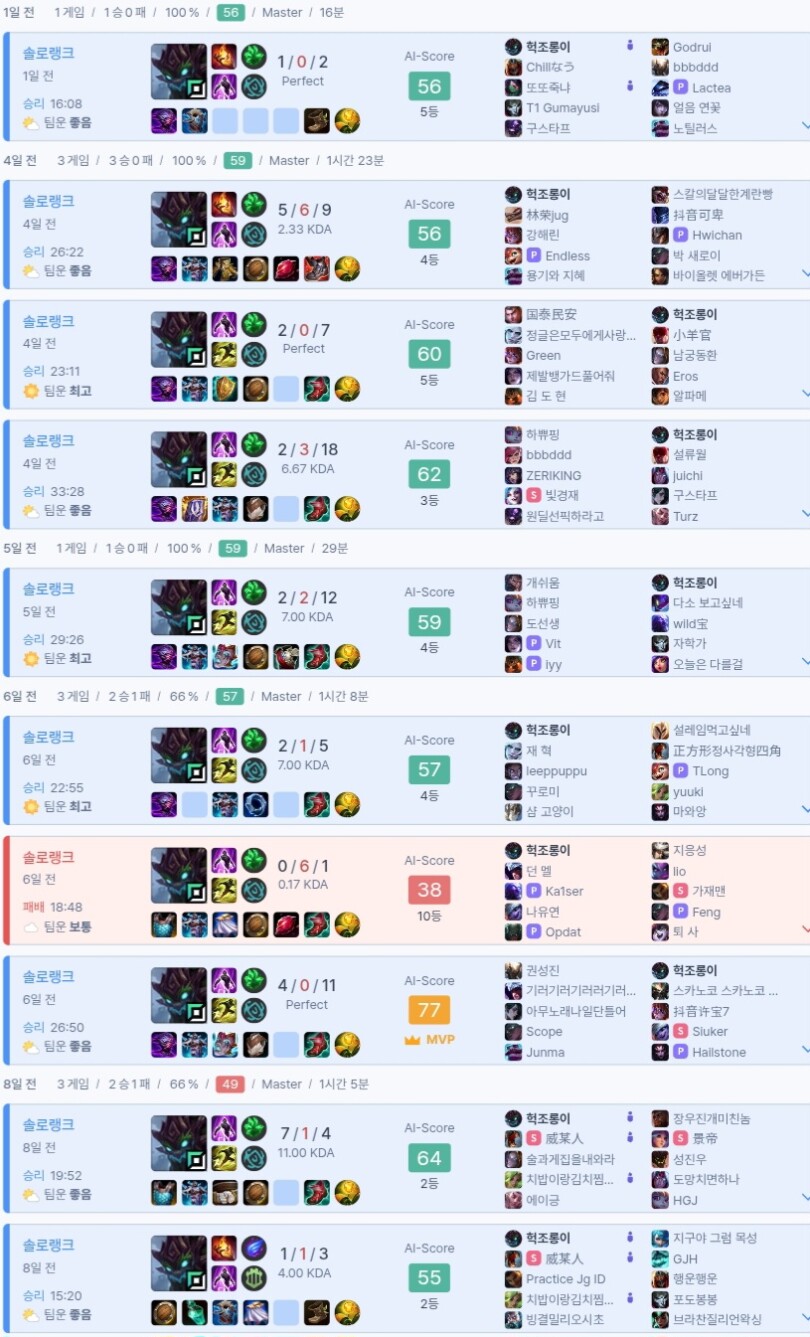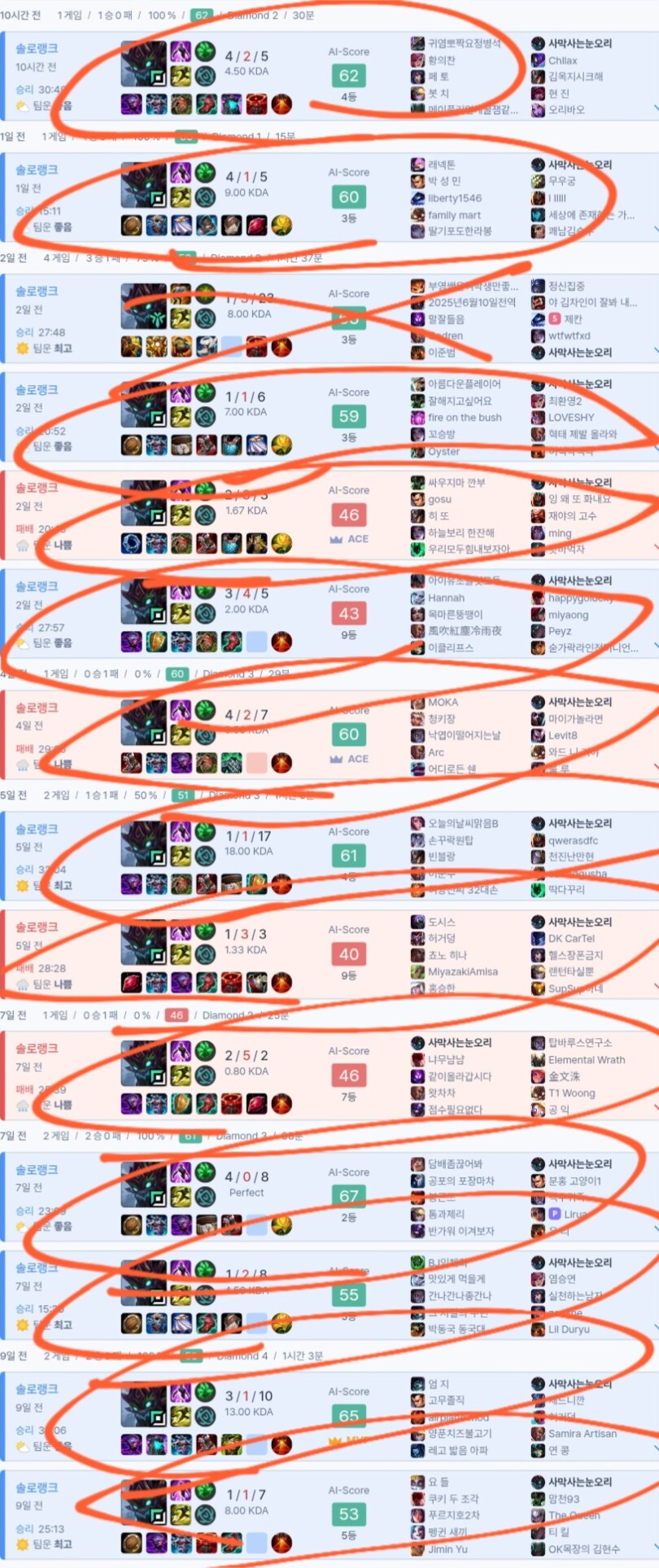 재슥짱(더배워와#kr1)님 최근 전적. 혹한 작쇼 빌드 좋다고 인정하심.