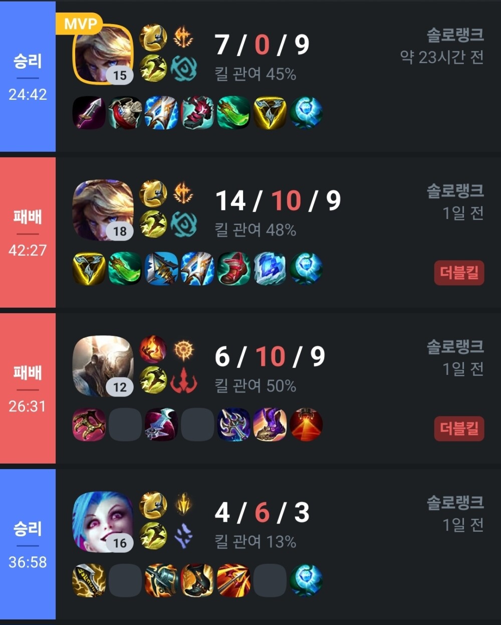 이번시즌 아이언4에서 실버2까지 올린 원딜 롤린이입니다. 실버로 올라오니 잘풀릴때는 잘하는데 말렸을때 푸는법을 잘 모르겠더군요. 또 고정시점 풀고 라인전하는것도 연습중인데 힘드네요.