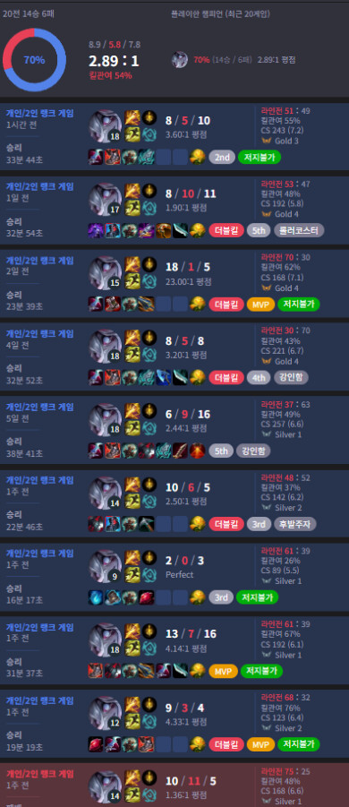 가장 최근의 전적은 이렇습니다. 멘탈이 안깨져야 연승 유지를 하고 불필요한 시간 낭비도 없을거라 생각해서 하루 한판, 할때 빡집중 한다 마인드로 했어요.