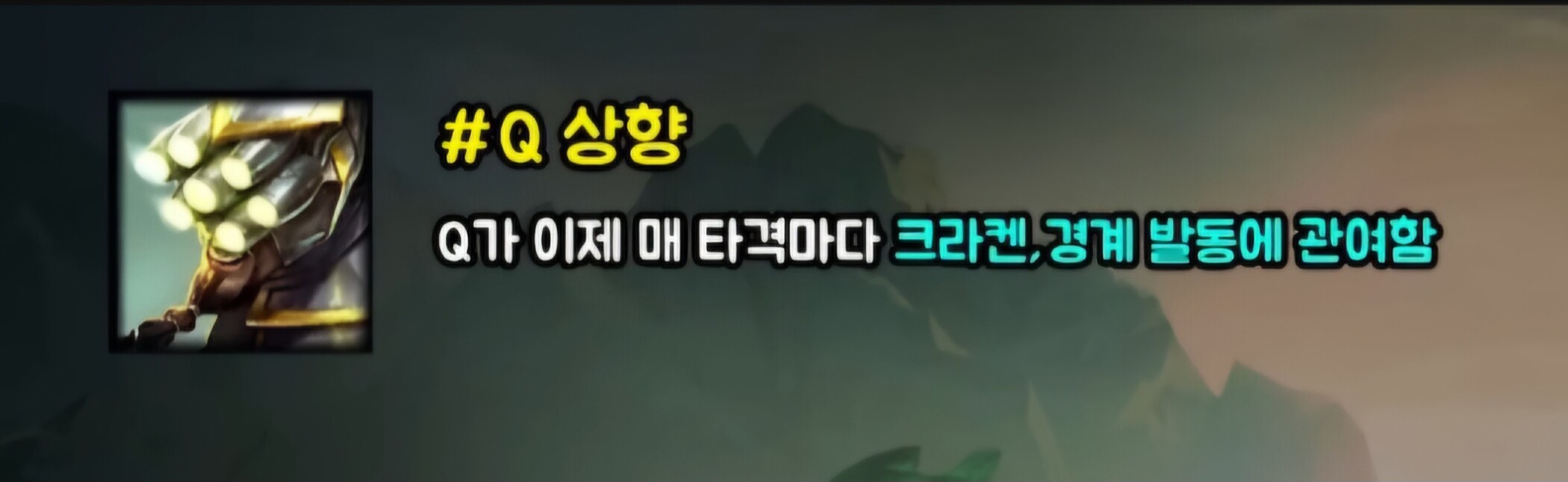 지금 마스터이 템트리가 대부분 몰왕->구인수->크라켄 이렇게 가는데 이번 패치가 꽤 유의미하다 생각해서 크라켄->몰왕->경계->구인수로 가봤는데 이거 뭔가 딜이 다름. 크라켄, 경계 Q에 다 터지고 나머지 몰왕하고 구인수로 부족한 대미지 다 채워넣는 느낌이라 진짜 내가 해봤던 마스터이 중에 제일 쎄다고 생각할 정도로 좀만 더 연구하면 1티어 그냥 먹겠는데? 싶을 정도로 좋은 느낌임.