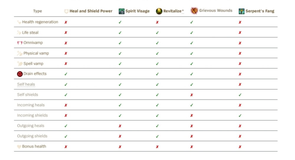 이 표를 잘 해석했다면: 힐/쉴 스텟과 소생 룬은 자연 체젠에 영향을 미치지 않습니다 최대체력증가는 어떠한 방법으로도 증폭시킬 수 없습니다 힐/쉴은 흡혈에 영향을 미치지 않습니다 (스킬 피흡 제외)