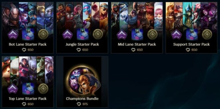 바로 롤 스타터팩. 상점에서 챔피언 - 세트로 들어가면 구매할 수 있는데 각 세트마다 라인별 챔피언 + 그 챔피언 스킨 3개뿐만 아니라 경험치 부스트와 룬 페이지까지 얻을 수 있음, 특히 근본스킨인 전투 토끼 리븐과 범죄도시 그브 스킨을 650RP로 얻을 수 있기 때문에 완전 강추함!