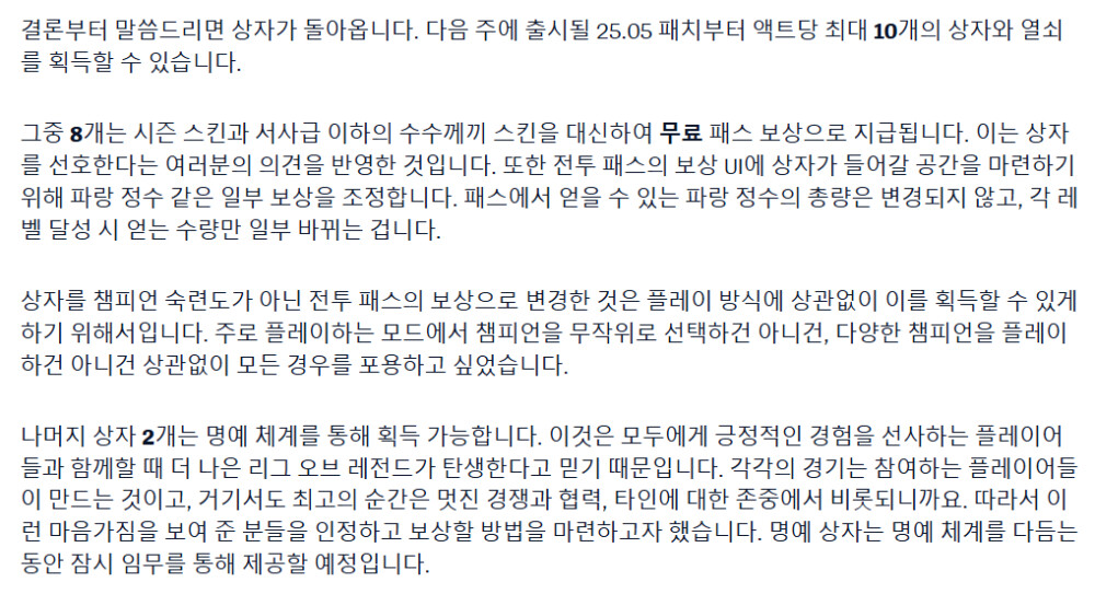 요약) 배틀패스 레벨업을 통해서 8개 획득 가능 명예레벨 및 보상을 통해서 2개 획득 가능 1년당 6액트 > 총 60개 정도 획득 가능 이정도면 개혜자긴하네요 획득 방법도 s랭크플레이 이젠 안필요하니 단순 판수가 중요해진듯 <아티클 자료> <배틀패스 레벨별 무료보상>