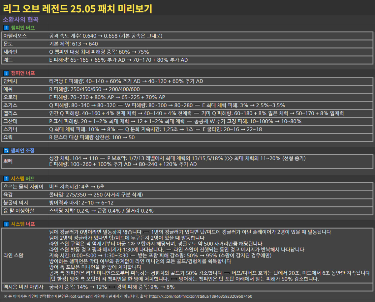 이미 많은 유튜버들이 다뤄서 안올릴까 하다가, 아직 옵지에 정리된 글이 없어서 올립니다 참고로 라이엇이 최근에 버전 넘버링 방식을 바꿔서, 25.S1.5 == 25.05 라고 보면 됨.