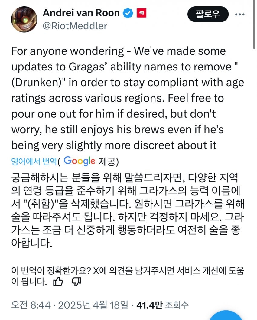 사유로는 전연령대를 준수하기 위해서 음주 요소를 뺀다고 합니다.