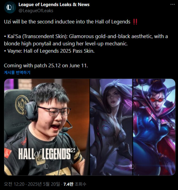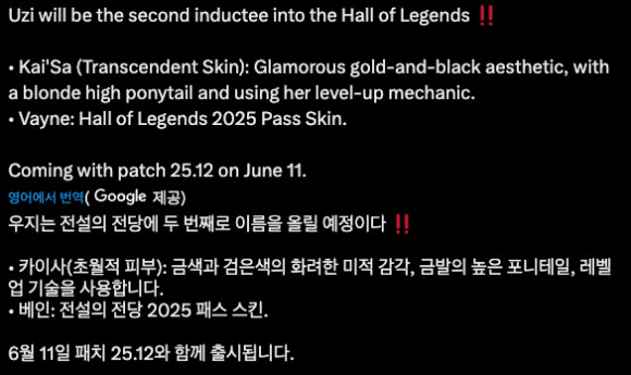 스킨 주인공은 우지 카이사가 초월 등급으로 베인이 패스 보상으로 나올 예정 출시일 6월 11일입니다.