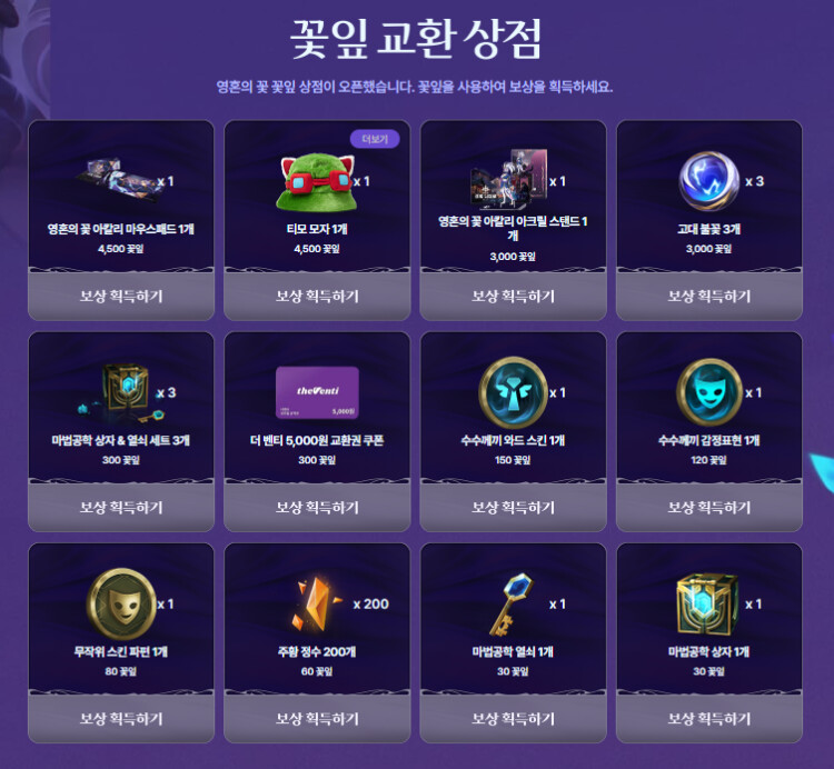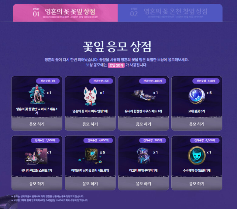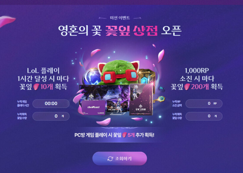 1시간당 10꽃잎, 1000RP 쓸때마다 200꽃잎 줌 응모 상점은 추첨이고
