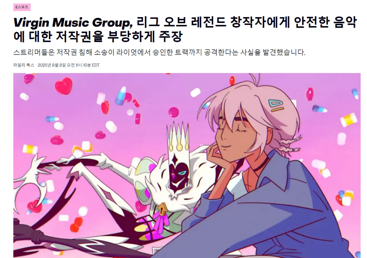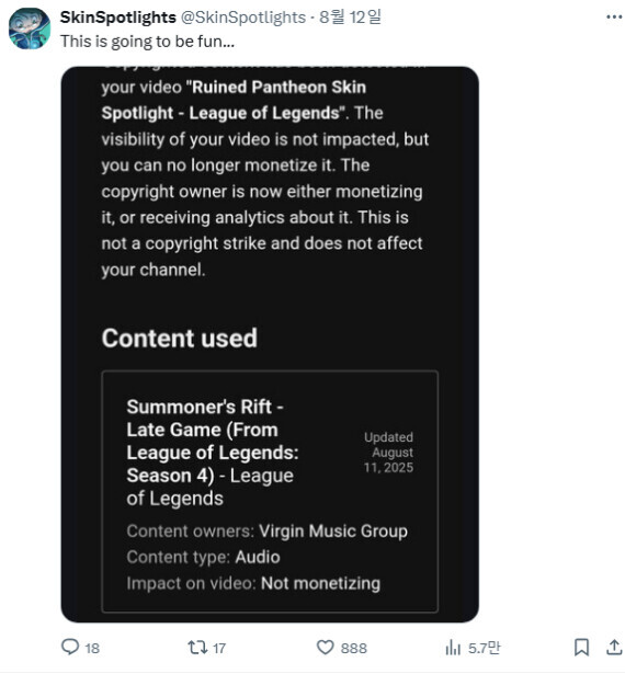 롤 공식 스킨 리뷰 채널 스킨스포트라이트도 Virgin Music Group의 소유권 주장을 피해가진 못했음 영상 수익정지