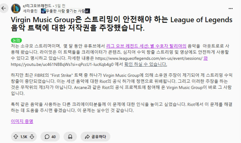 그 후 Virgin Music Group이 라이엇 곡들 사용한 모든 영상에 소유권 주장하면서 저작권 위반 신고 -> 라이엇 곡 사용한 모든 유튜버들은 수익 막힘 ㅋㅋ