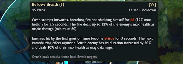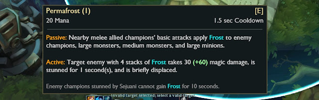 "패시브 : 근처 아군 근접공격 챔피언의 기본 공격은 적 챔피언, 대형 몬스터, 중형 몬스터 및 대형 미니언 에게 서리를 적용 합니다 ."