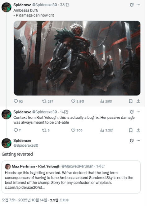 암베사 패시브에 치명타가 터지도록 패치 예정이였으나 갈하에 맞게 챔이 바뀌는건 장기적으로 좀 에바라고 생각되었는지 취소함