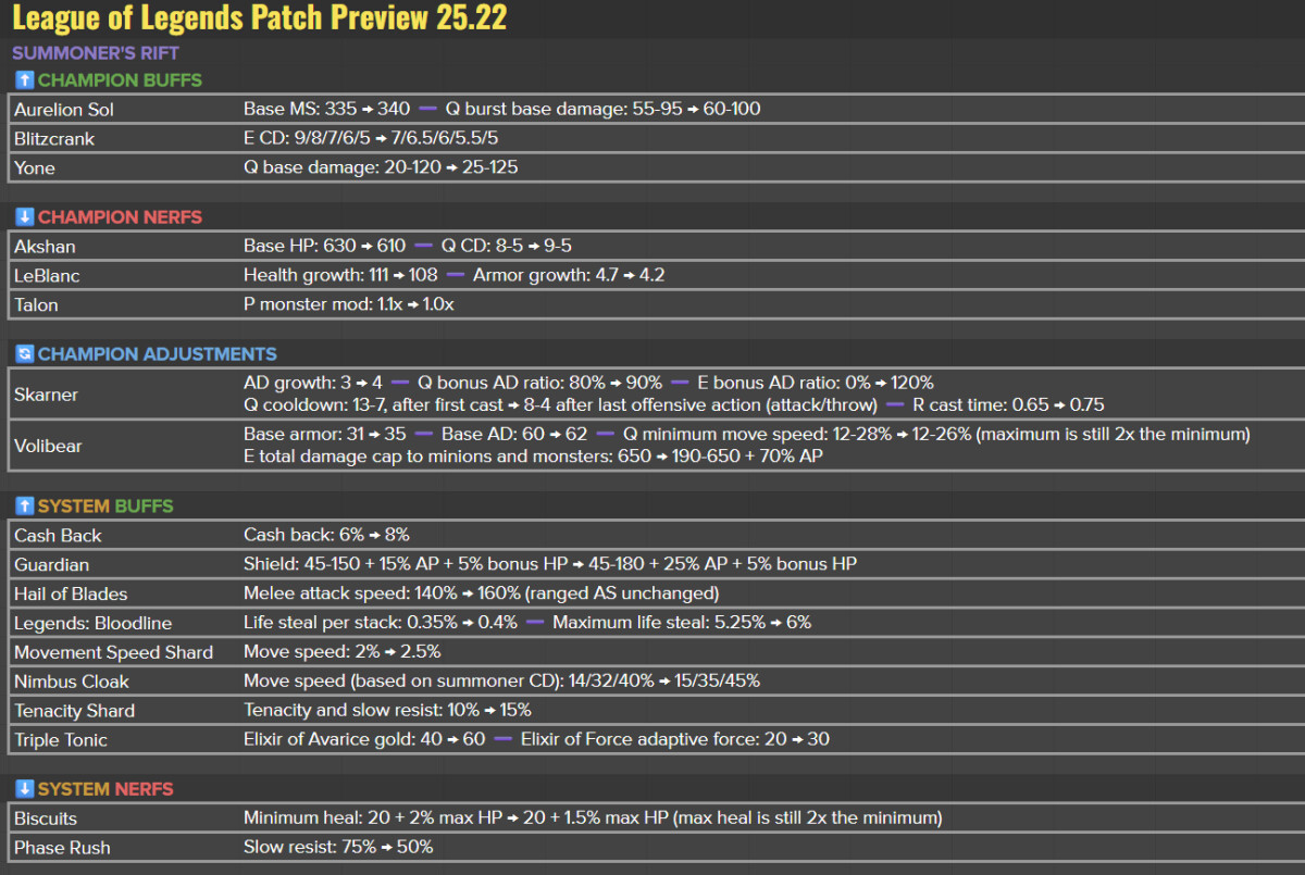 핏빛 길: 스택당 0.35 → 0.4% 환급: 6% → 8% 빛망: 14~40% → 15~45% 삼중물약: 골드 40 → 60, 적응형 능력치 20 → 30