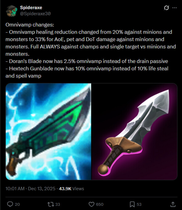 도란검: 2.5% 모피흡 총검: 10% 모피흡 모피흡: 챔피언에게 항상 100% 미니언, 몬스터에게 범위딜 & 도트딜 33%만 적용 이제 패시브 능력이 아니기에 다재다능 중첩에 포함될 것으로 예상됨