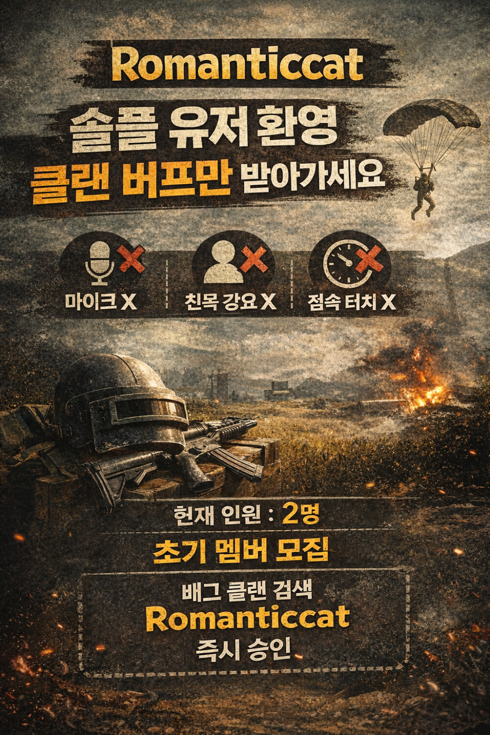 배그 클랜 검색 → Romanticcat 편하게 신청 주세요. 확인하는 대로 바로 승인합니다.