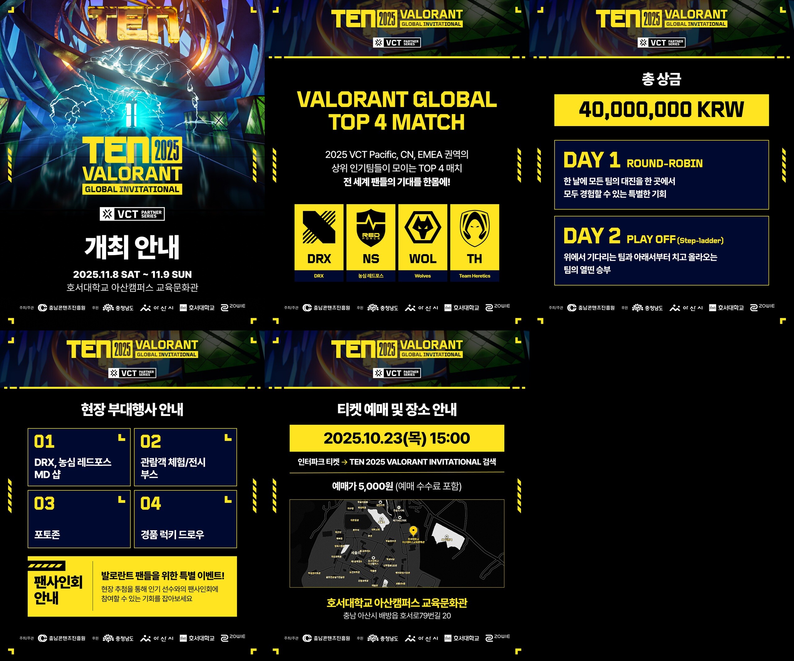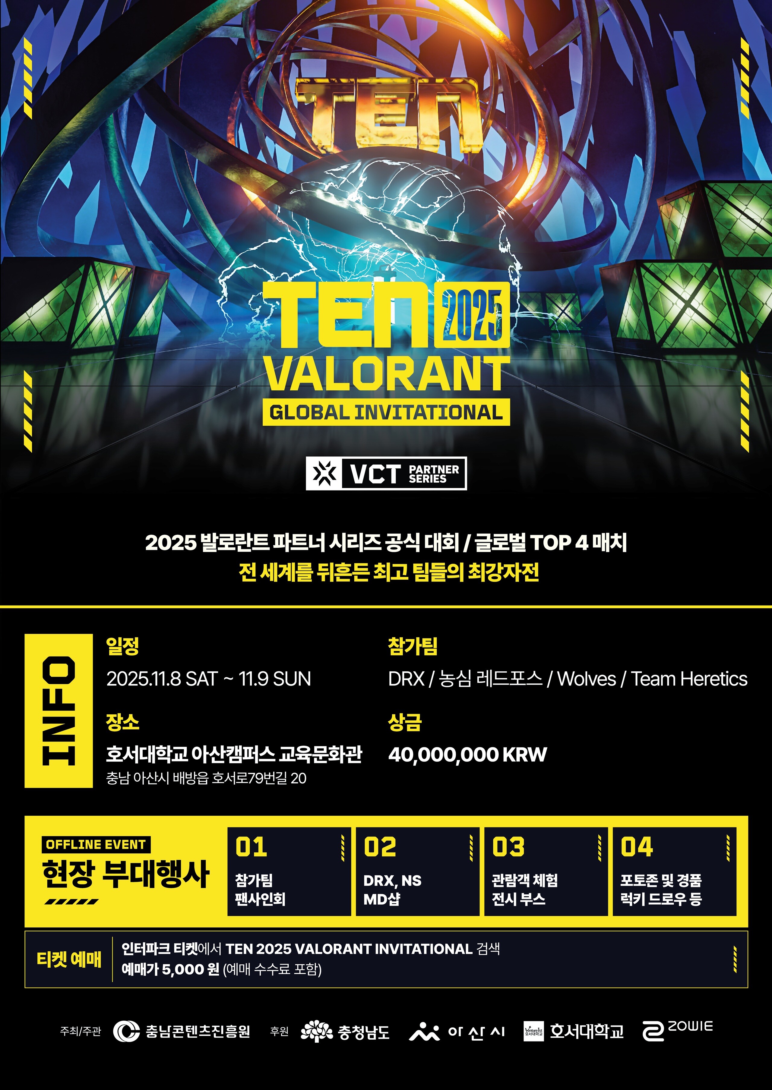 🎯 TEN 2025 VALORANT Invitational 대한민국 발로란트 팬들이 기다려온 최고의 초청전이 충남 아산에서 펼쳐집니다! 🏟️ 장소: 호서대학교 아산캠퍼스 교육문화관 📅 일정: 11월 8일(토) ~ 9일(일) 🎫 티켓 예매: 10월 23일(목) 오후 3시, 인터파크 오픈! (예매가 5,000원 / 수수료 포함) 🔥 충남 최초 발로란트 프로 대회! DRX, 농심 레드포스, Wolves, Team Heretics VCT PACIFIC, CN, EMEA 대표 인기팀이 한자리에! 🎮 경기 구성 DAY1 - 전 팀 맞대결 Round Robin DAY2 - Playoff (스텝 래더 방식) 👉 첫날엔 모든 팀 경기를 한자리에서 관람 가능! 🎁 현장 즐길거리 • 농심 레드포스 굿즈 MD샵 (DRX 굿즈 MD샵은 미진행됩니다.) • 체험 & 전시 부스 • 포토존 & 팬사인회 • 경품 럭키드로우 등 다양한 이벤트까지! ⚡ 충남 아산, e스포츠 중심지로 도약! 뜨거운 함성과 함께 지역 팬들의 에너지를 느껴보세요.